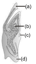 Given below a L.S. of an embryo of grass. Identify the labelled part (a), (b), (c) and (d) and select correct option about them :-
